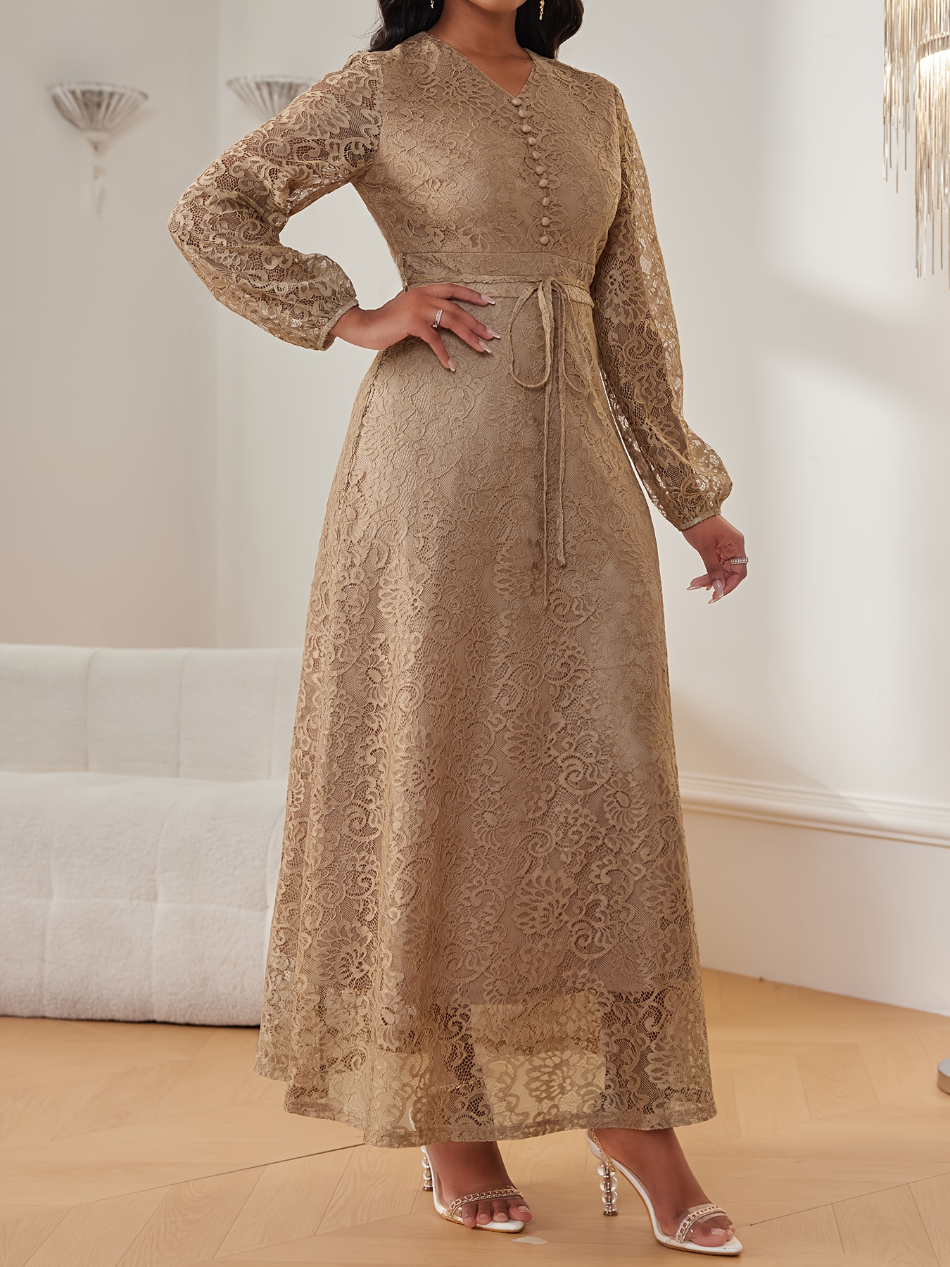 Women's Elegant Beige V-Neck Long Sleeve Dress with Puff Sleeves & Adjustable Waist Tie - A-Line Silhouette Floor-Length Formal Party Wedding Guest Dress, Machine Washable Solid Color HRYY332, Evening Gown, Highquality Material, Tailored Fit, Adult Women