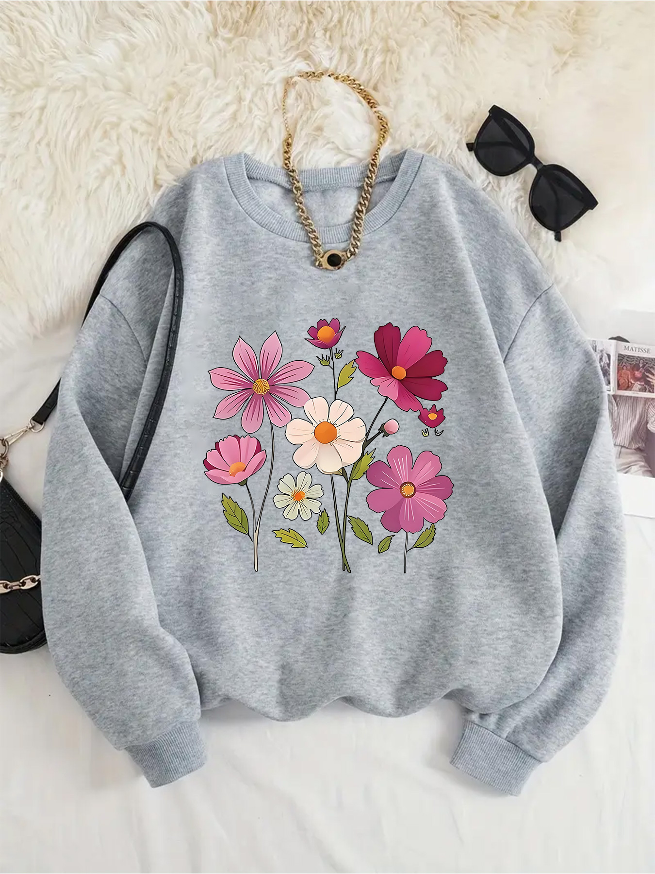 Women's Floral Print Crew Neck Sweatshirt - Pink with Multicolor Flower Design, All-Season Casual Pullover, Soft Machine-Washable Fabric, Cozy Everyday Sweater for Women (No Dry Clean)