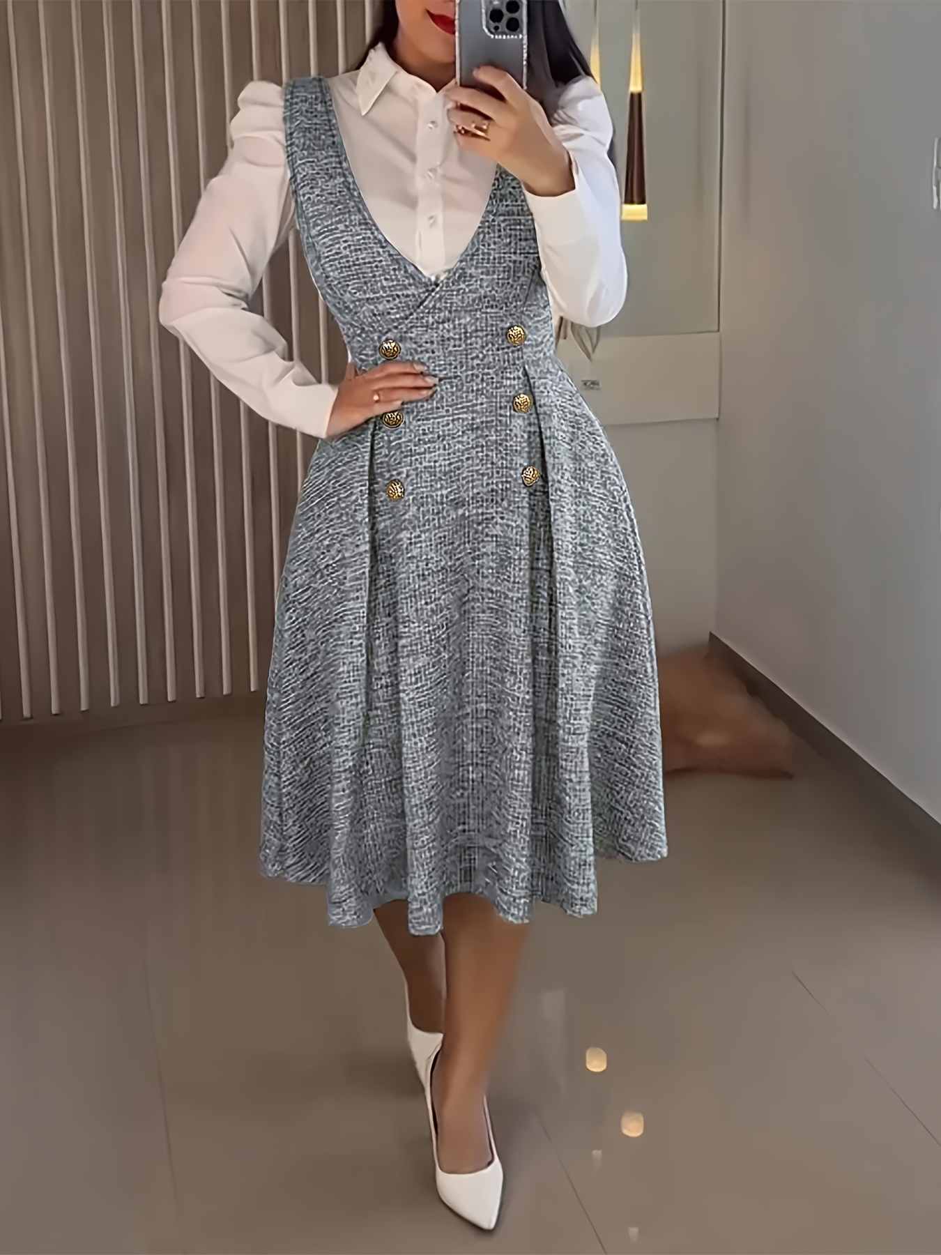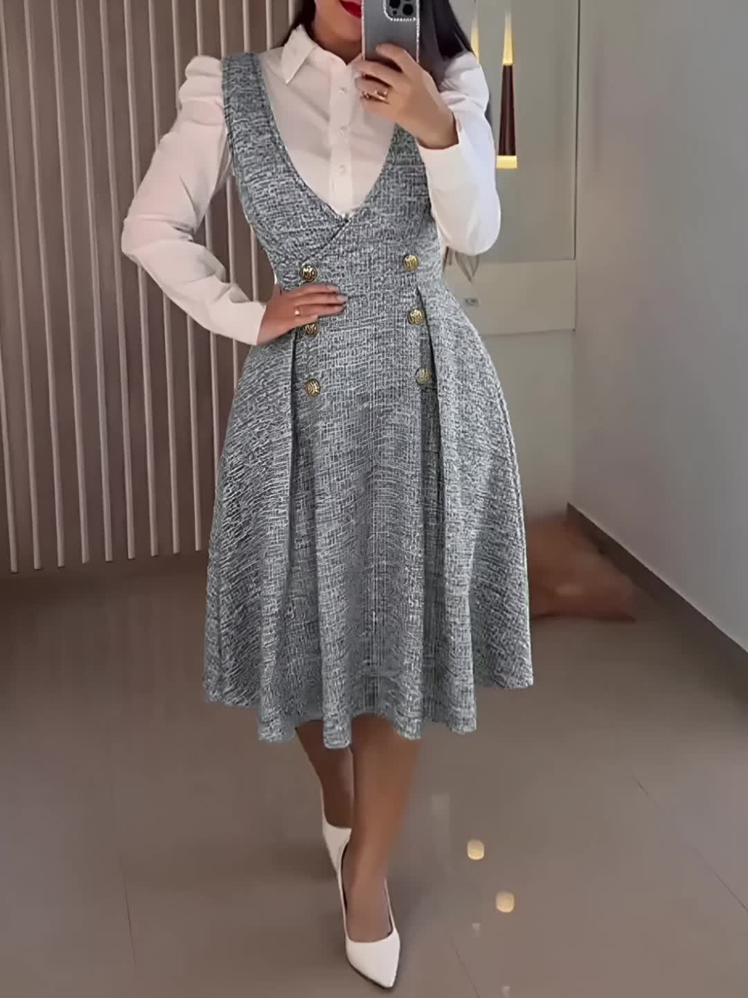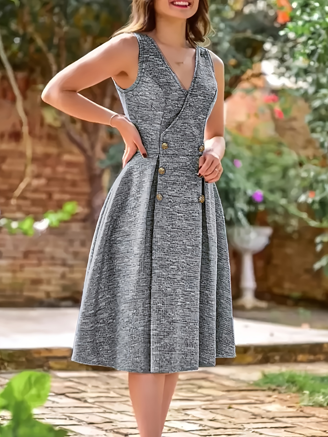 Elegant Women'S Dress - Deep V-Neck, Sleeveless A-Line with Button Detail, Fitted Silhouette, Gray Plaid Pattern, Perfect for Fall/Winter, Adult Fashion, Elegant Attire | Sleeveless Fashion | Construction, Cute Dresses