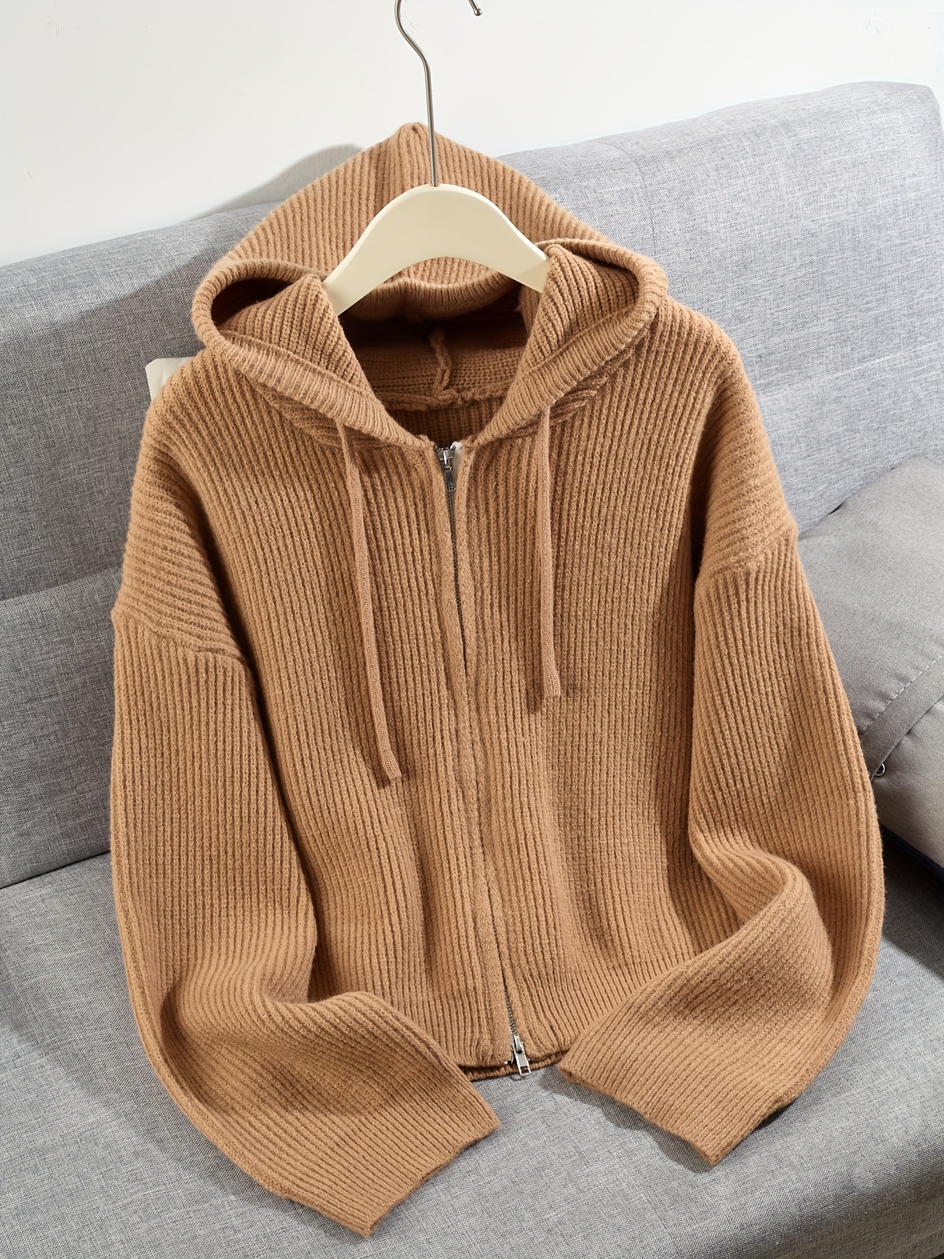 Women's Casual Oversized Hooded Cardigan - Thickened Winter Sweater with Double Zipper Front, Ribbed Cuffs & Hem, Earthy Brown, Medium Stretch for Fall & Winter Layering
