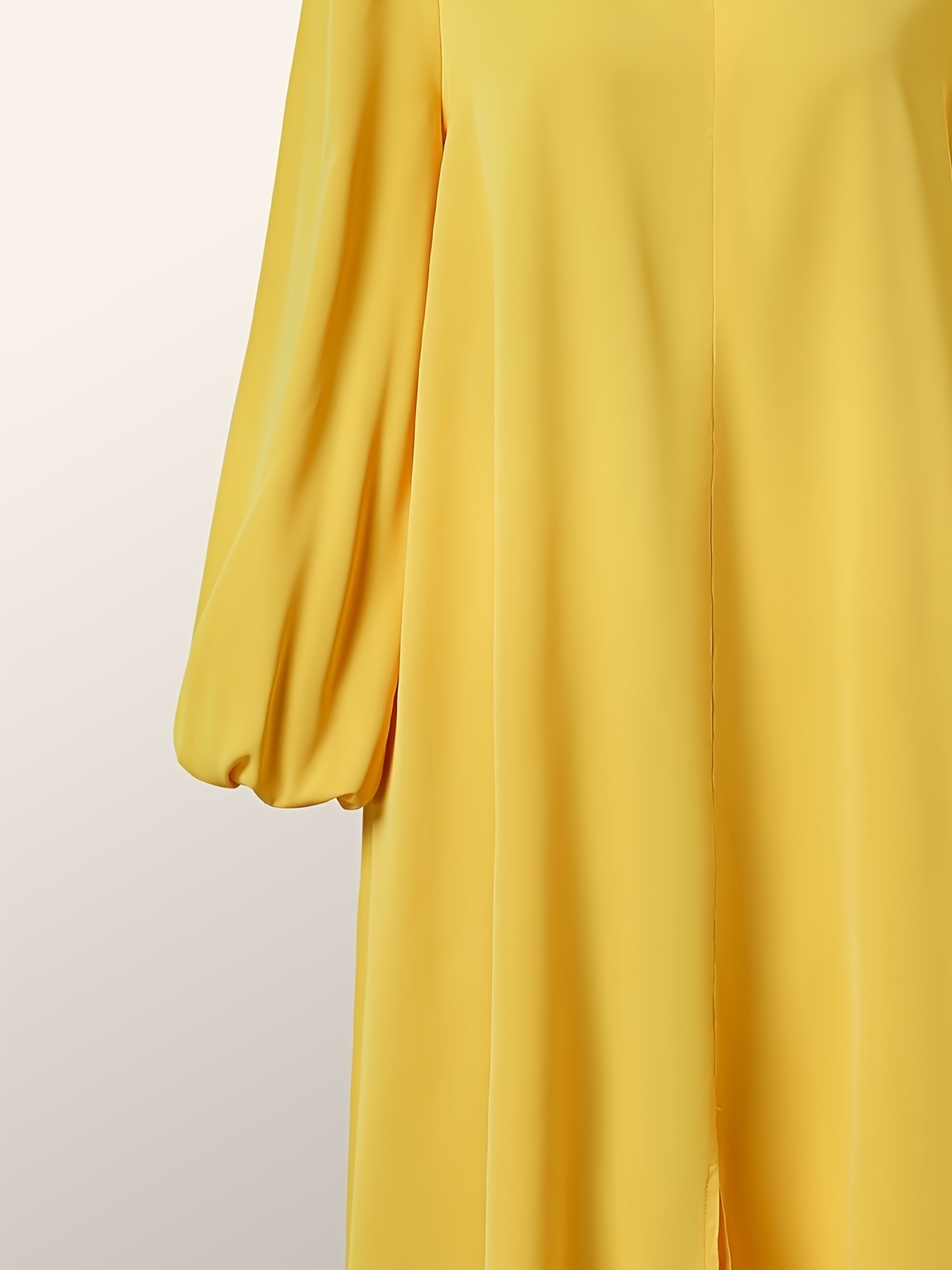 Women's Elegant Mustard-Yellow Loose-Fit Shirt Dress with Stand-Up Collar & Lantern Sleeves - Adjustable Drawstring Waist, Long Sleeves, Machine Washable, Spring/Summer/Fall Casual to Semi-Formal Wear, Flowy Fabric Gown
