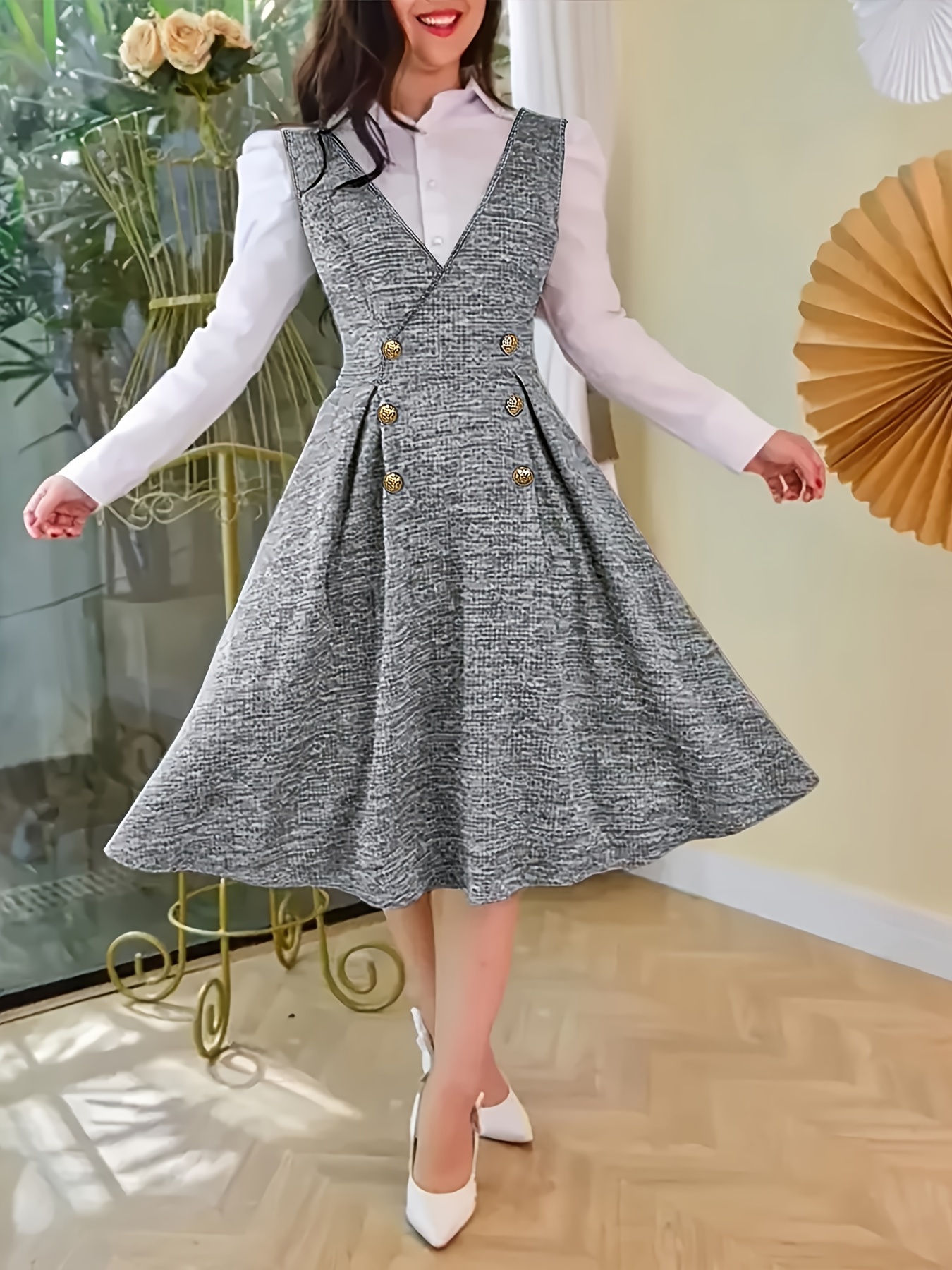 Elegant Women'S Dress - Deep V-Neck, Sleeveless A-Line with Button Detail, Fitted Silhouette, Gray Plaid Pattern, Perfect for Fall/Winter, Adult Fashion, Elegant Attire | Sleeveless Fashion | Construction, Cute Dresses