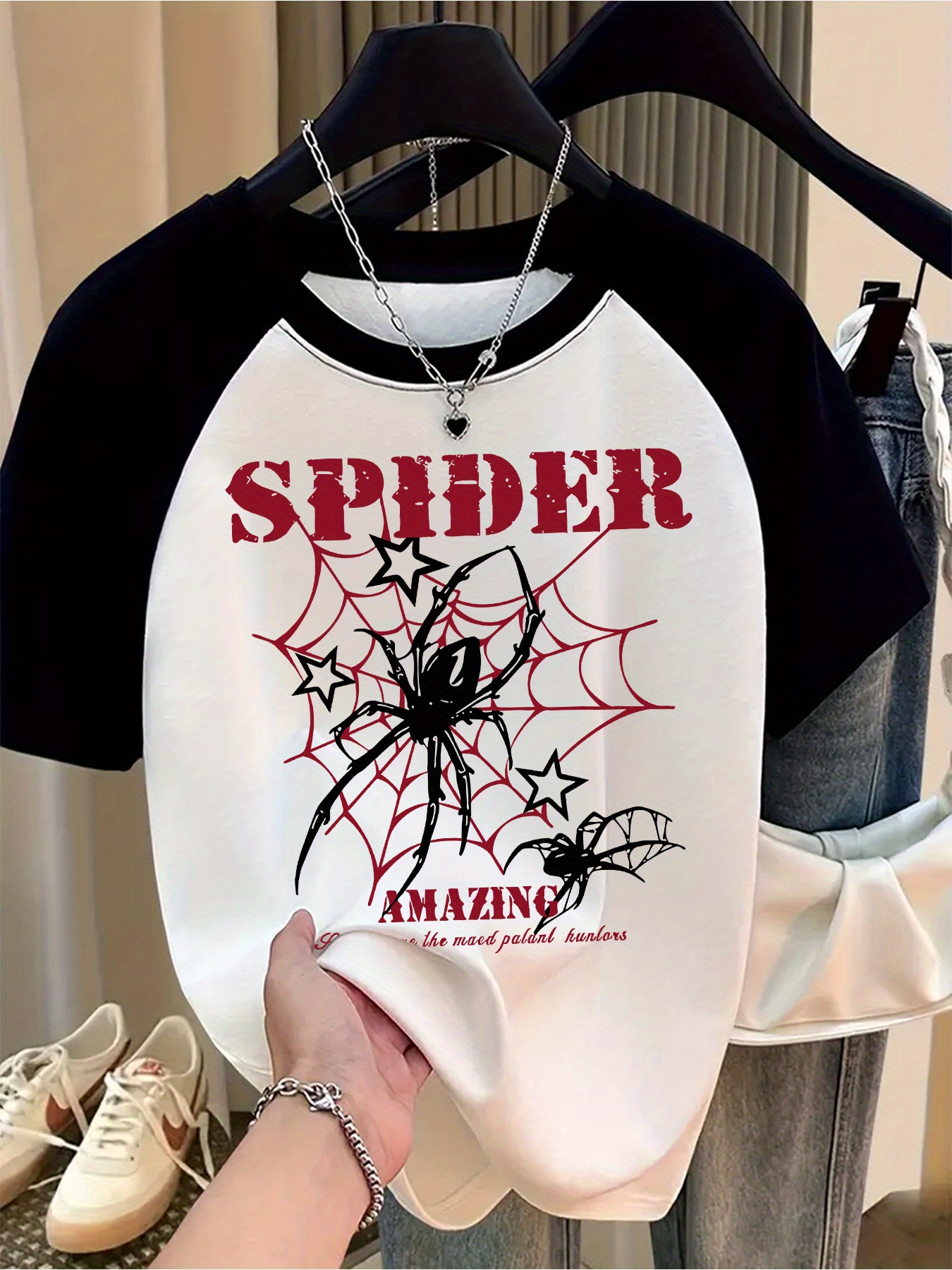 Women'S Spider Graphic T-Shirt - White & Black Color Block, Casual Crew Neck Short Sleeve Tee with "SPIDER AMAZING" Print, Lightweight Polyester for Summer, Casual Attire | Spider Graphic Tee | Glossy Texture